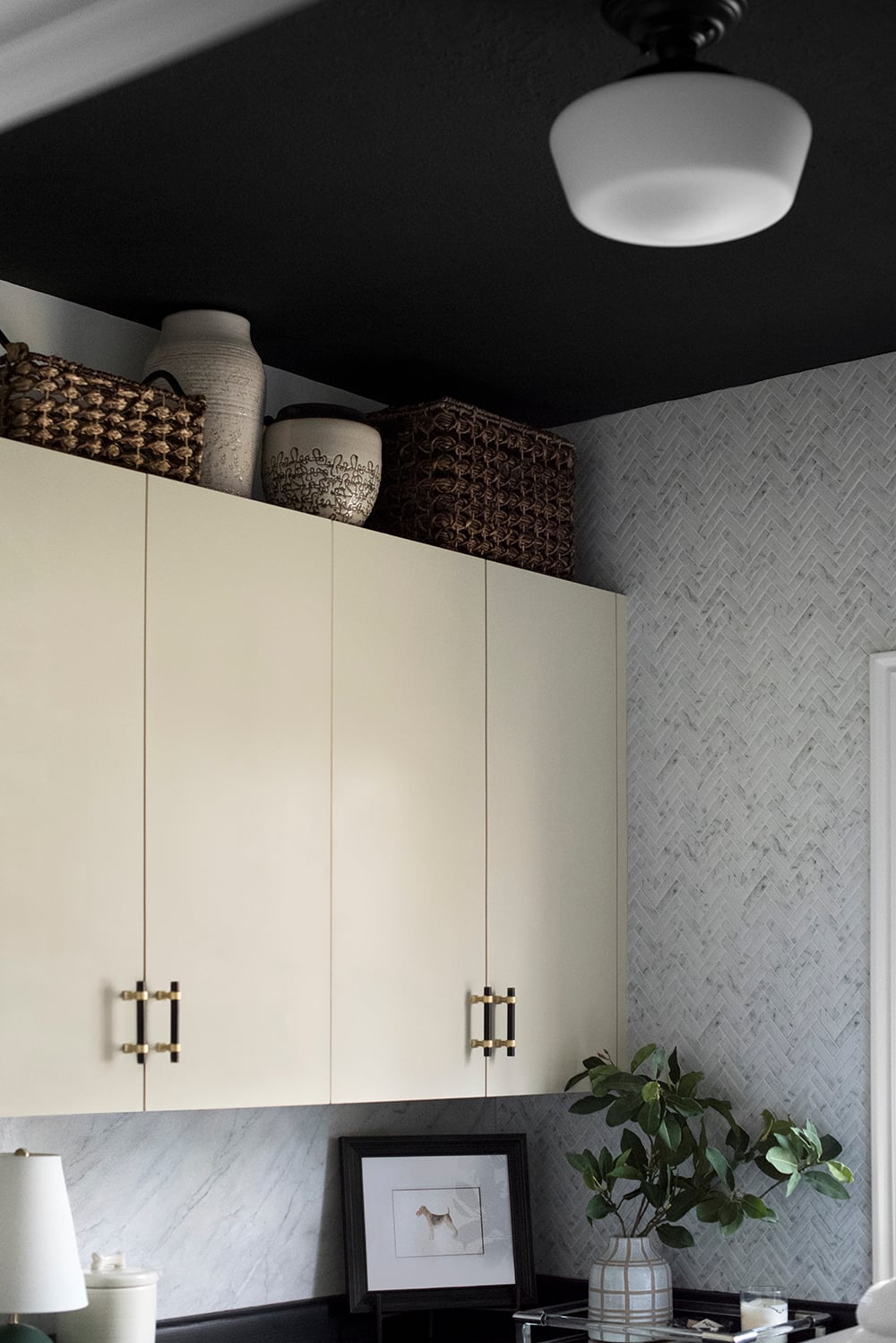 Although some people might shy away from painting their ceiling black, Room for Tuesday gets the gold star for being daring with her selection of SW Tricorn Black. And it pays off in a big way in this laundry room.