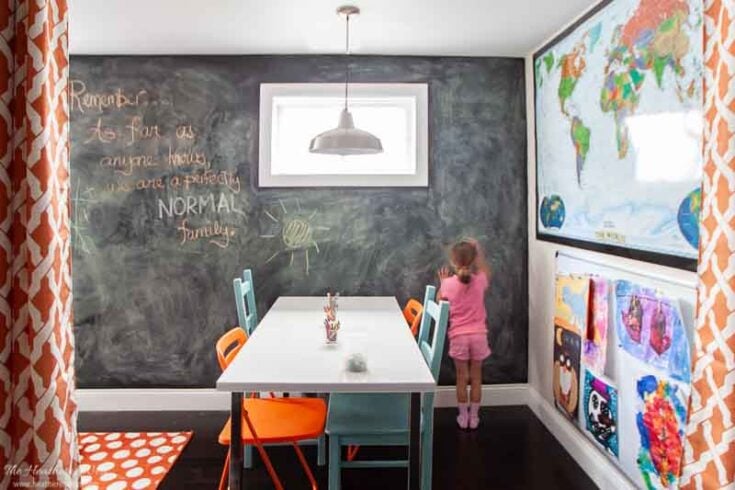 Chalkboard paint creates a fun, unique and functional accent wall for kids and adults alike to enjoy. This one is in our basement playroom. The bright colors of the chairs really stand out.