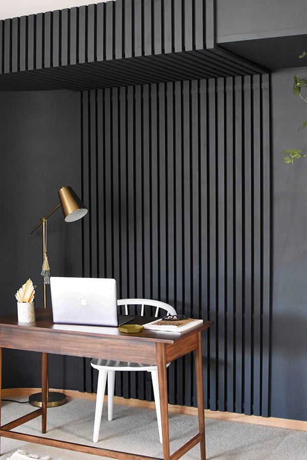 Such a creative black painted feature wall created with inexpensive wood slats! I love the texture and dimension she created with these little trim pieces. What an upscale look for a home office.