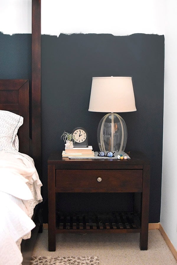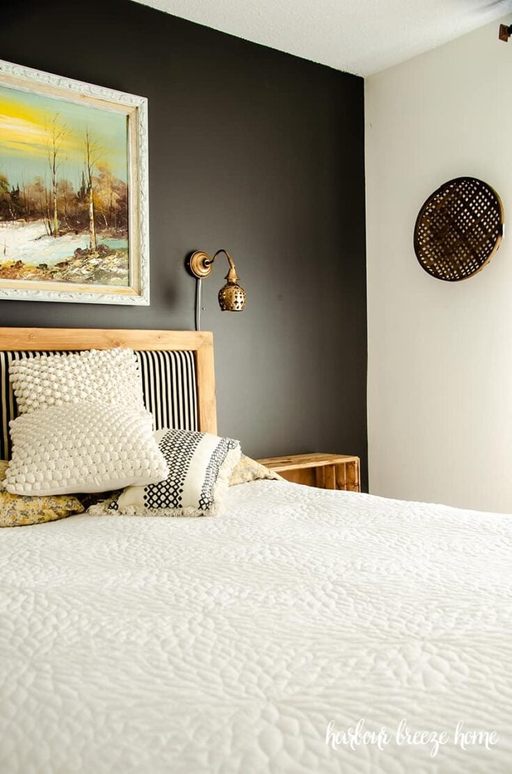 Another example of how a black accent wall in a bedroom directly behind the bed can introduce such an impactful statement! Here, Liz from Within The Grove adds a feature wall painted inย Iron Ore by Sherwin Williams.