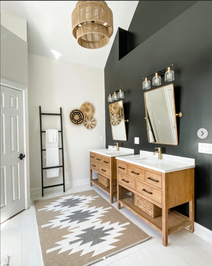 The walls in this space are a bright, very popular white (Sherwin Williams Pure White), and the accent wall behind the sinks was painted SW Caviar.