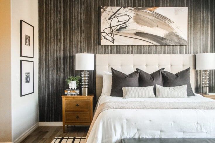 Rachael and her husband gave their bedroom a bold new look with the power of peel and stick wallpaper! The print she chose? A dark, moody black grasscloth look, and WOW, what a difference it made! Proof that while paint is powerful, it's not the ONLY way to create a black accent wall with pizazz!