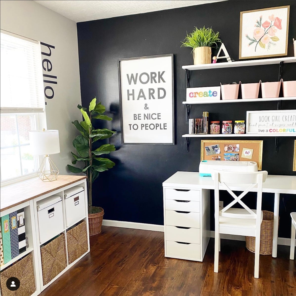 Amy chose a punchy wall color, Glidden Black Onyx, for her home office...AKA her craft room, and the choice couldn't have been better. That black slate palette allows all the primary colors in her crafty accessories to pop, and gives the space a bright, welcoming feel.