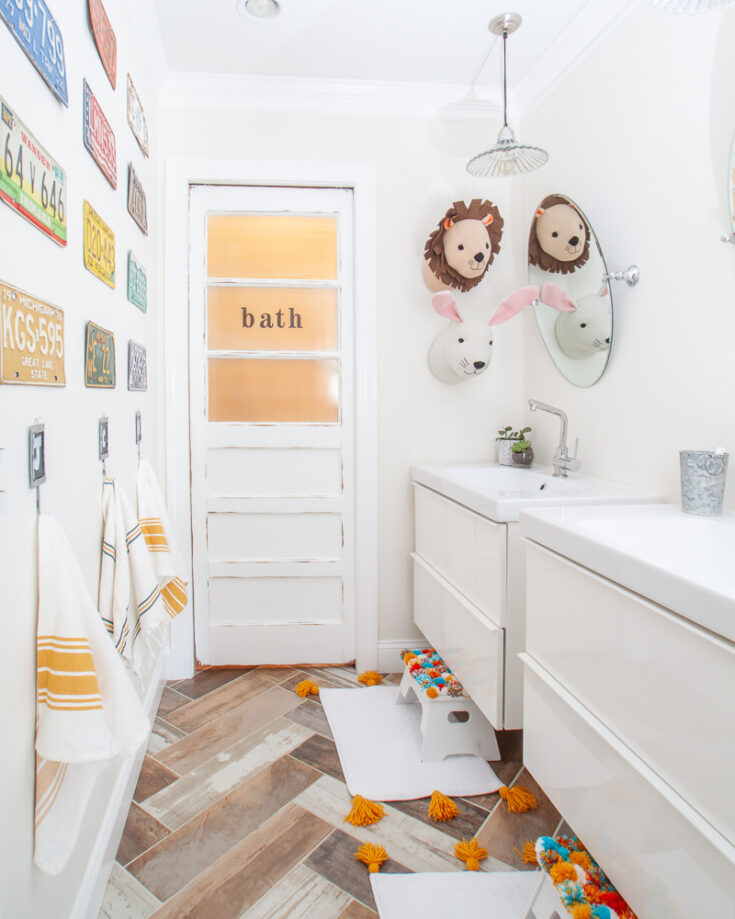 The antique pendant lights were thrifted, and I still adore them. And the mirrors were saved from the previous renovation as well. The sinks are IKEA, and have held up incredibly well despite going on 10+ years with three kids.